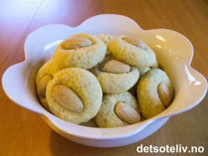 Det er enkelt å gjøre mens mandlene er. Her er en gammel og kjempegod oppskrift på Sandkaker som lages med skåldede mandler. Se også den tradisjonelle oppskriften på Sandkaker eller den svenske varianten som heter Mandelmusslor. Oppskriften gir stk.