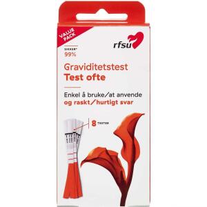 Finn laveste nettpris her. En praktisk pakke med åtte graviditetstester i form av enkle strips, som tillater at du kan teste ofte til en fornuftig pris. Du kan utføre testen fra den dagen du skulle hatt menstruasjonen, og det sikreste er å måle morgenurinen.